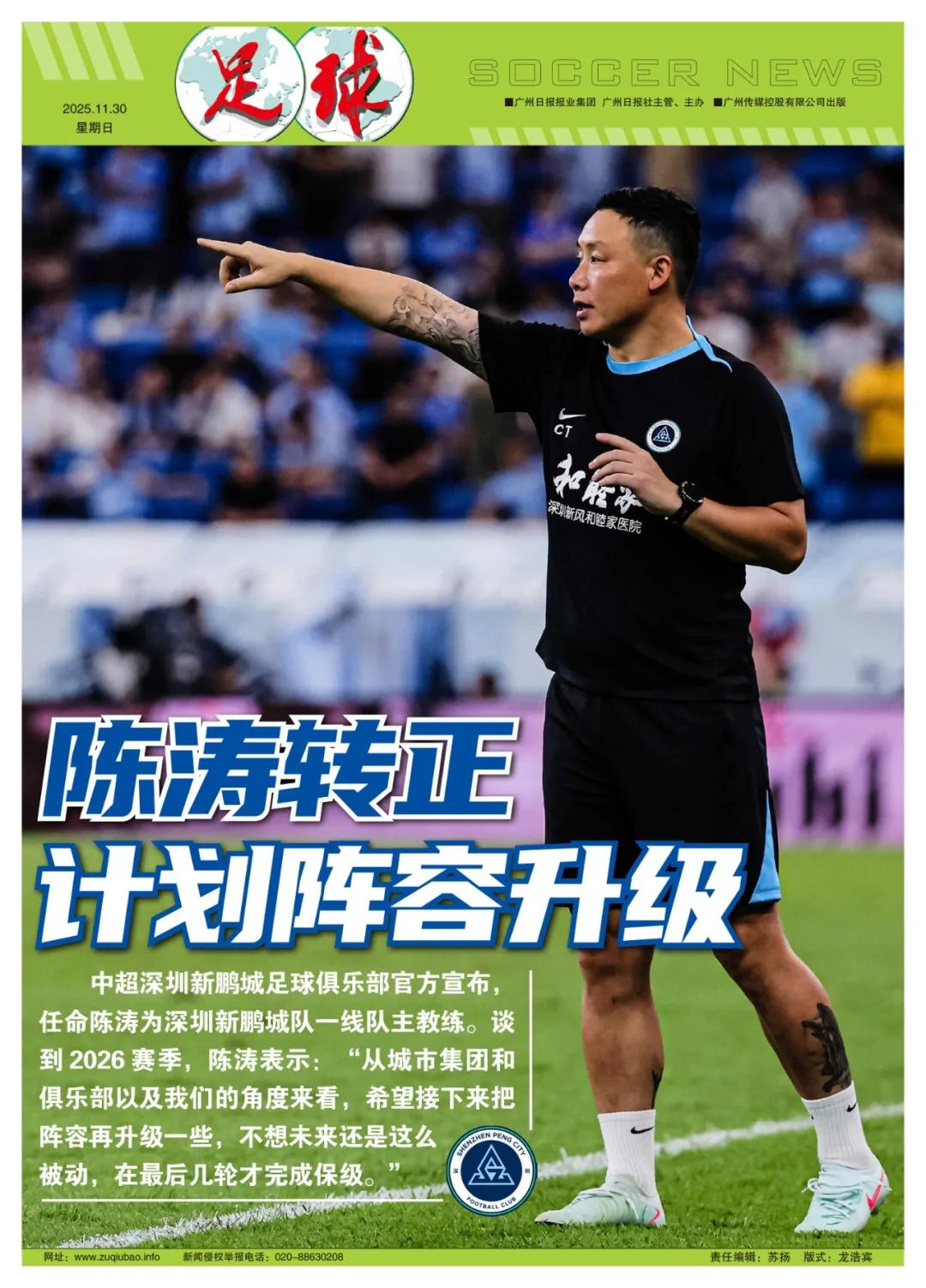记者王伟报道 11月29日下午,中超深圳新鹏城足球俱乐部官方宣布,任命陈涛为一线队主教练,这位40岁的国产教练将在新赛季正式拿起球队教鞭。“从城市集团和俱乐部以及我们的角度来看,希望接下来把阵容再升级一些,不想未来还是这么被动,在最后几轮才完成保级。”谈到2026赛季,陈涛说。